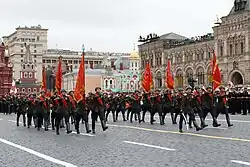 The Soviet Order of Alexander Nevsky was worn on the right side of the chest and when in the presence of other Orders of the USSR, placed after the Order of Bogdan Khmelnitsky 3rd class.[2] The early Russian Federation Order of Alexander Nevsky was also worn on the right side of the chest and when in the presence of other Orders, placed after the Order of Kutuzov 2nd class.[3]