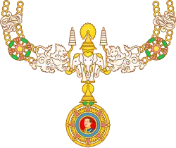 - Collar - The collar consists of sixteen Royal Ciphers of King Rama V in pink enamel and seventeen gold rosettes fastened to each other by chain links. The centre of the collar has an oval medallion with Airavata elephants, enamelled in white, and a gold crown with a starburst at the top. Flanking the medallion on either side are two gold lion supporters, carrying Royal Parasols. The whole piece is topped with white bows.