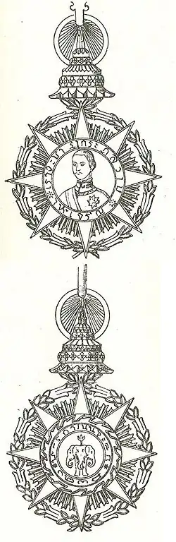 - Medal - The medal, also known as the 'Junior Companion', is a silver disc. The central piece bears a portrait of King Rama V and is surrounded by a raised band, engraved with the motto "I Shall Maintain My Royal Family". The whole piece is edged with a wreath and topped with a crown with a starburst. The reverse of the medal is engraved with Airavata elephants bearing the Trident and Thai script. The whole piece is surrounded by a Chakra and gold wreaths. The medal is suspended from a pink silk band of 4 cm wide, to wear on the left chest.
