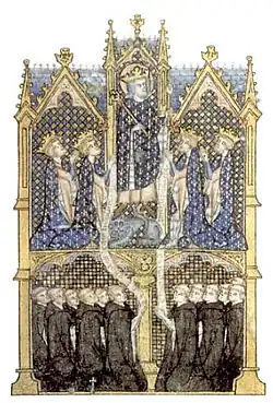 According to tradition, the mother house of the order was founded in 1201 by William, Richard, Evrard and Manasses, four scholars from the University of Paris. They adopted the Augustinian rule and the Victorine usage and were approved by Pope Honorius III in 1219.[2] The name 'Valley of Scholars' was in use by 1215 and William was the first prior of the order. The title prior was initially preferred to abbot out of humility.[2] The prior of the mother house (and of the order as a whole) was elected by its canons in the presence of the priors of the first three daughter houses, Bonvaux, Belroy and Épineuseval.[3] The chapter general of the order, consisting of all the priors, met once annually in the mother house.[4]