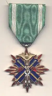 The badge was a gilt starburst for the 1st-5th classes and different design in gilt for the 6th class and in silver for the 7th class. It was suspended on a ribbon in blue-green with a white stripe near the edges, worn as a sash on the left shoulder by the 1st class, as a necklet by the 2nd and 3rd classes, on the left chest by the 4th and 5th classes. The badges for 6th and 7th classes were non-enameled.