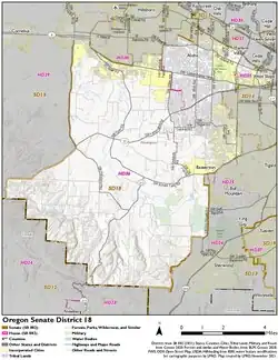 District 18 of the Oregon State Senate comprises parts of central Washington County centered around Aloha and encompassing parts of Beaverton and Hillsboro. It is composed of Oregon House districts 35 and 36. It is currently represented by Democrat Wlnsvey Campos of Aloha.