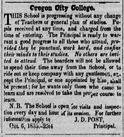 - ^ a b c d e f g h i j k l m n Lange, Erwin F. (Dec 1936). "Oregon City Private Schools, 1843-59". Oregon Historical Quarterly. 37 (4). Oregon Historical Society: 317–323. JSTOR 20611017.