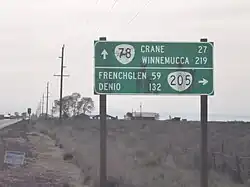 OR 205 begins at the Roaring Springs Ranch as a continuation of Catlow Valley Road, which connects with Nevada State Route 292 near Denio, Nevada. It travels north along the edge of the Catlow Valley and turns east to enter Frenchglen in Blitzen Valley. The highway continues north on the rim of Jackass Mountain through parts of the Malheur National Wildlife Refuge, crossing between Harney Lake and Malheur Lake in Sunset Valley. After briefly turning west to cross Wrights Point, OR 205 continues due north through Harney Valley and terminates at a junction with OR 78 east of Burns.[5][6]
