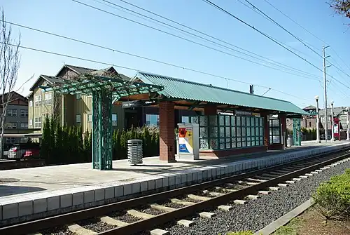Orenco station is located south of Northeast Cornell Road and west of Northeast Century Boulevard adjacent to Northeast Orenco Station Loop.[33] The station serves the Orenco Station neighborhood. It was within TriMet's fare zone 3 until the agency discontinued all use of fare zones in 2012.[34] Designed by OTAK Inc.,[35] Orenco station features an island platform with a shelter, ticket vending machines, and a passenger information display.[33][34] There is a 24-hour park and ride with 125 spaces nearby,[1] as well as a 50-space bike-and-ride facility operated by BikeLink.[2][36][37] Between the station and Northeast Cherry Drive is Plaza Park, a public plaza bounded by mid-rise, mixed-use buildings that collectively make up the Platform District.[38]