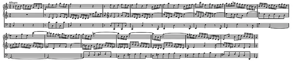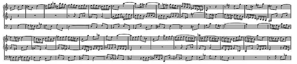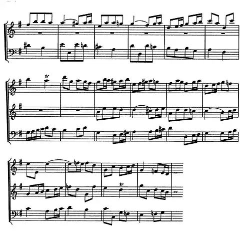 The fugal last movement of BWV 529—in contrast to the more forward-looking first movement—follows established patterns. The opening theme—the first subject—is similar to that of the earlier Allegro in the Violin Sonata No. 3 of Corelli's Op. 5[20] and that of the later four-part fugue in A♭ major in Book II of The Well-Tempered Clavier. In BWV 529, the pedal also participates as a third voice in the fugue: the quaver chief motif of the first fugue subject (the first six notes) fits well with the pedal; and later on in the second subject the semiquavers in the manuals are also taken up in the pedal part.