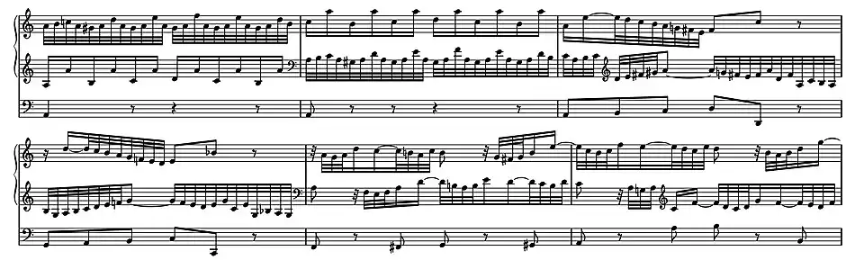 - A, bars 1–12. Fugal three-bar subject in A minor in the upper manual with a continuo accompaniment in crotchets and quavers in the pedal. A bar before the entry of the subject in the lower manual a fourth below, the chromatic countersubject starts in the upper manual. In the last five bars (mm. 8–12), there is counterpoint between the keyboards derived from figures in the chromatic countersubject, partly in sequence and partly in imitative responses.