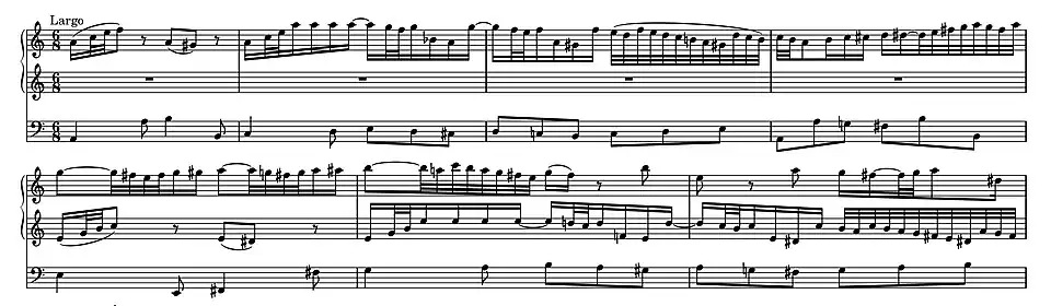 Williams (1985) gives a broad musical description of the Largo as a movement with two voices in dialogue over a continuo bass combining aspects of three different musical forms: fugue, ritornello and da capo aria. Together these create a mood or affekt tinged with melancholy. In the opening bars the first fugal subject and countersubject are heard in the manuals over the continuo bass. The elegiac passage with the lyrical subject and countersubject in counterpoint is heard several times, scarcely altered, during the movement. It is instantly recognizable each time it returns and plays the role of a ritornello. The second subject starts at bar 13 and illustrates the other groups of musical figures that Bach employs in the movement.