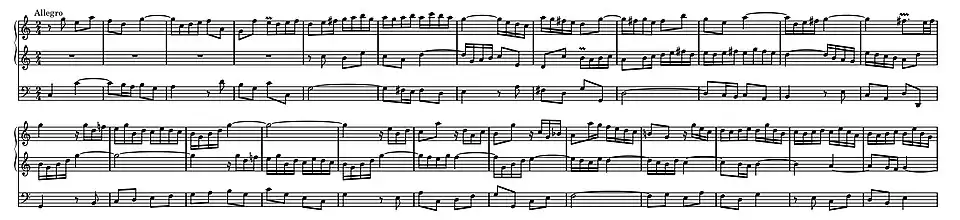 This brightly scored and skillfully composed movement has a da capo ABA form. In structure and texture, it resembles a trio sonata in the galant style for two flutes and continuo. The range of the keyboard parts, however, is beyond that of such instruments; and the succinct and idiomatic keyboard writing with intricate development sections is typical of the organ sonatas. The A section is 50 bars long. After the 54 bar development section B, it is reprised in its entirety.