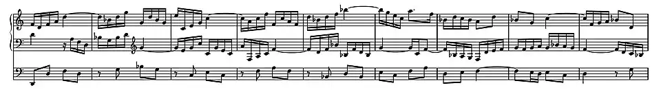 - B, second subject, bars 29–59. The second subject is heard in the tonic key in the upper keyboard, answered by the lower keyboard and then the pedal an octave lower. At bar 39, it is heard in the lower manual in A minor, answered in the upper manual with the lower manual in parallel thirds. The first subject is then heard again with its countersubject in A minor, starting in the lower manual. At bar 51 section B concludes with an eight-bar coda similar to the close of section A: the upper voices alternate in playing the semiquaver chief motif of the second subject over four statements of the chief motif of the first subject in the pedal.