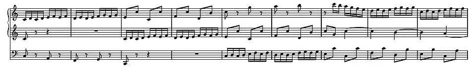 - B, bars 13–20. Section with second subject in C major. In the first bar, there are sequences of demisemiquavers in the upper part and semiquavers in the lower part, inverted and exchanged between the parts in the next bar. After a two-bar interlude with contrary motion between the parts and further demisemiquaver figures, the imitative phrases in the episode from section A are heard again, before a reprise in reverse order of the two opening bars of demisemiquaver/semiquaver figures.