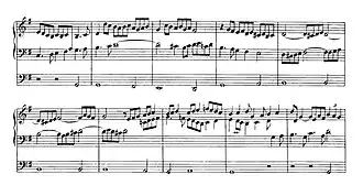 Secondly the limitation to three movements, omitting a first slow movement, was perhaps a conscious decision of Bach.[16] In the earlier collection of sonatas for violin and obbligato harpsichord (BWV 1014–1019), mostly composed in four movements, the opening slow movements have long cantilena melodies for the solo violin. This style of writing would not have translated well to the organ: indeed Bach reserved such lines for the elaborate cantus firmus parts in his ornamental chorale preludes. In the sonatas for violin and harpsichord, Bach does not adhere to strict trio sonata form in the slow movements, where the upper part in the obbligato harpsichord part can be divided into two voices; and where the violin can fill out the harmonies with double stopping. In the organ sonatas the harmonies are provided by the pedal and the two manual parts, which play single melodic lines throughout.[17]