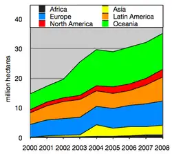 Organic agricultural land increased almost fourfold in 15 years, from 11 million hectares (27 million acres) in 1999 to 43.7 million hectares (108 million acres) in 2014.[114] Between 2013 and 2014, organic agricultural land grew by 500 thousand hectares (1,200,000 acres) worldwide, increasing in every region except Latin America.[114] During this time period, Europe's organic farmland increased 260 thousand hectares (640,000 acres) to 11.6 million hectares (29 million acres) (+2.3%), Asia's increased 159 thousand hectares (390,000 acres) to 3.6 million hectares (8.9 million acres) (+4.7%), Africa's increased 54 thousand hectares (130,000 acres) to 1.3 million hectares (3.2 million acres) total (+4.5%), and North America's increased 35 thousand hectares (86,000 acres) to 3.1 million hectares (7.7 million acres) total (+1.1%).[114] As of 2014, the country with the most organic land was Australia (17.2 million hectares (43 million acres)), followed by Argentina (3.1 million hectares (7.7 million acres)), and the United States (2.2 million hectares (5.4 million acres)).[114] Australia's organic land area has increased at a rate of 16.5% per annum for the past eighteen years.[115]