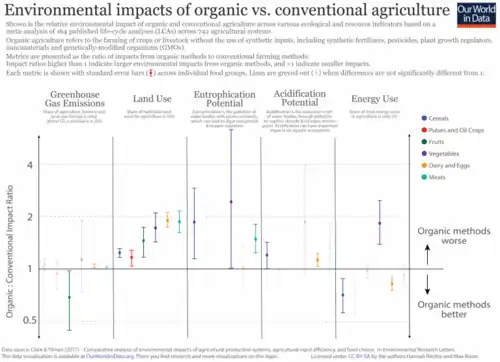 Compared to conventional agriculture, the energy efficiency of organic farming depends upon crop type and farm size.[100][129]