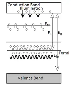 A sufficiently energetic light can excite charge carriers so much that they will populate the initially empty localized levels. Then, the density of free carriers in the conduction and/or the valence band will increase. To account for these changes, steady-state Fermi levels are defined for electrons to be EFn and, for holes, EFp. The densities n and h are, then equal to