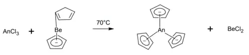 The synthesis of the AnCp3 usually follows the reaction scheme shown above[4][15] with a few more added steps that are sometimes needed to synthesize the trichlorides from the commercially supplied oxides.[14] Nevertheless, other syntheses are also used by some authors: alkali metal cyclopentadienides can be used instead of the beryllium complex, and An(IV) complexes can also be used via a reductive elimination reaction.