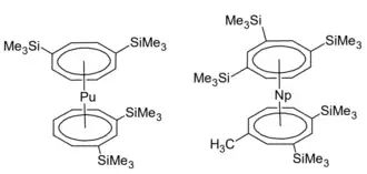 Plutonium also forms a sandwich complex with 1,4-bis(trimethylsilyl)cyclooctatetraenyl (1,4-COT’’) and its 1,3 isomer. This compound is prepared by the oxidation of the anionic green Pu(III) complex Li(THF)4[Pu(1,4-COT’’)2] with cobalt(II) chloride which leads to the formation of Pu(1,4-COT’’)(1,3-COT’’). The reaction is easily noticeable by the THF solution changing to a dark red colour, characteristic of Pu(IV).[11]