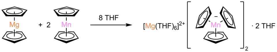 25Mg-NMR spectroscopy suggested the Mg-Cp interaction has significant covalent character.[55] However, because of lacking (n-1)d orbitals and back bonding,[56] the Mg-Cp interaction is weak, enabling cyclopentadienyl magnesium complexes to serve as Cp− precursor. For example, in the following reaction Cp2Mg transfers two Cp− ligands to synthesize the [MnCp3]− anion:[57]