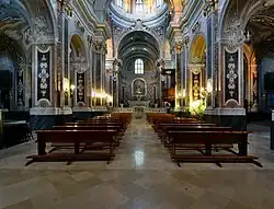 The new church was reconsecrated in 1756.[1] The façade includes a clock tower to the left and a campanile to the right. The dome is covered with polychrome tiles. The interior is richly decorated. The interior of the church has a crypt with niches containing mummified bodies.[1]