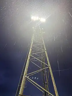Oriel Park has an all-weather pitch, the current pitch having been laid in 2017.[5] There are two covered stands in the ground, one on either side of the pitch. The main stand on the Carrick Road side of the ground contains the dressing rooms, the club bars, offices, and club shop. The 'Shed', on the opposite side, houses the ground's commentary box and principle camera position. The Shed fronts the club's Youth Development Centre (YDC), which was built in 2010.[6] There is uncovered seated terracing on either side of the main stand and standing room behind the eastern goal (the 'Town End'). There is an access road to the YDC behind the western goal (the 'Carrick End').