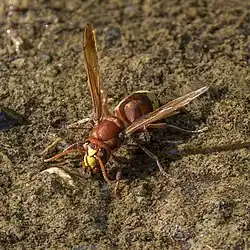 The Oriental hornet (Vespa orientalis) is a social insect species of the family Vespidae. It can be found in Southwest Asia, Northeast Africa, the island of Madagascar (but no reports have been made of its presence on the island for many years), the Middle East, Central Asia, and parts of Southern Europe.[2] Oriental hornets have also been found in a few isolated locations such as Mexico and Chile due to human introduction.[5][6] The Oriental hornet lives in seasonal colonies consisting of caste system dominated by a queen.[2] The hornet builds its nests underground and communicates using sound vibrations.[7] The hornet has a yellow stripe on its cuticle (exoskeleton), which can absorb sunlight to generate a small electrical potential, and this might help supply energy for digging.[8] The adult hornet eats nectar and fruits and scavenges for insects and animal proteins to feed to its young.[9] Because they are scavengers, the hornets may also serve as a transmitter of disease following consumption of infected plants.[10] The hornets are a primary pest to honey bees, attacking bee colonies to obtain honey and animal proteins.[11] The sting of an Oriental hornet can be quite painful to humans and some humans are allergic to stings.[10]
