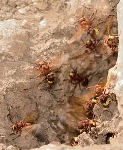 Unlike most wasps which are most active during the early morning, V. orientalis is unique in showing a peak of activity during the middle of the day.[8] Oriental hornets dig their nests underground by picking up soil in their mandibles, flying a short distance, dropping the soil, and returning to the nest to continue digging.[8] The hornet's digging is correlated with insolation (solar energy). The more insolation, the more active the hornet.[8] This daytime digging behavior of V. orientalis may be possible because of the ability of its cuticle to harvest solar energy.[8]