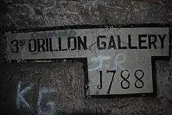 The 3rd Orillon Gallery is at the centre of the Northern Defences and links into St. Patrick's Chamber. The gallery dates from 1788 but the battery disappeared some time later. This space was used as a kitchen and a period oven is still in situ. Evidence of the substantial wooden floor that was created for the 3rd battery can still be seen. The battery was created by large planks that would have rested on the perimeter ledges that can still be seen. They would have created a platform for the battery nearly two metres above the existing floor.[2]