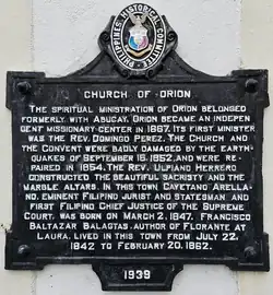 Orion was established by the Dominican Priests on April 30, 1667. The present-day 19th-century church was built by Father Jose Campomanes, OP after an earthquake in 1852 which destroyed the previous structure.[1]