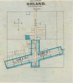 Orland is recognized as the first settlement in Steuben County,[5] populated by migrants from Vermont and originally known as Vermont Settlement. Each year in late July, Orland celebrates this heritage with the Vermont Settlement Festival. Orland was settled in 1834 after a Vermont man named John Stocker had gone prospecting for his family and the families of his neighbors. Stocker chose this particular piece of land because of the rich burr-oak openings he found. Pioneers coming from Windham County, Vermont, arrived shortly thereafter and built a Baptist church.[6] The town established a post office in 1837.[7]