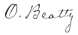 Beatty was married three times throughout his life, with each marriage ending due to the death of his wife. His first marriage was to Sarah Lewis Rochester, a relative of the founder of Rochester, New York, and RIT president Nathaniel Rochester, on September 19, 1839; the couple had one child, Charles, and Sarah died after "a year or two", according to Yerkes, Hays, and Blayney.[22][30][a] Beatty's second marriage was to Mildred Ann Bell in 1848, and his second child, Pattie, was born of this marriage.[25][31] Mildred died in 1867 and is buried with Beatty. He was married for a third and final time in 1879, to Elizabeth Boyle, widow of Jeremiah Boyle; they did not have children and Elizabeth died in 1886.[25] Beatty was a slaveowner, and the 1860 census lists him as having owned one slave.[32]