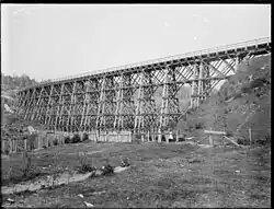 J & A Anderson & Co of Christchurch won a tender for a wrought iron replacement on 16 November 1904 and completed the work with a ceremonial driving of the last rivet on 20 October 1906.[69] In the same era Andersons also rebuilt Kopua (1895), Makotuku (1898), Matamau (1899), Mangatera (1900) and Makatote (1908) viaducts.[70] There are 6 large viaducts on the 24.57 km (15.27 mi) between Kopua and Dannevirke, including Makotuku Viaduct, between Ormondville and Makotuku, which is 128 m (420 ft) long and 26 m (85 ft) high,[71] over Makotuku Stream, a tributary of the Manawatū River.[72] There was a minor fire on the viaduct on 1 February 1931.[73]