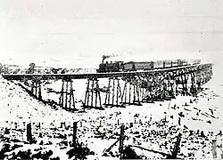 In 1878[30] about 100 navvies were working on the 5 mi 22 ch (8.5 km) Makotuku extension of the line from Napier and Spit to Kopua.[31] The work had been let out in small contracts to settlers from Danevirke, Makaretu, Norsewood and Ormondville.[32] It included 3 large viaducts (Kopua, Ormondville and Makotuku) over the Manawatū River and its tributaries.[33] Work was delayed by subsidence near Kopua;[34] it had been planned to complete the extension by 29 July 1879. There was no formal opening of this section, which was delayed by a couple of days by a slip.[35]
