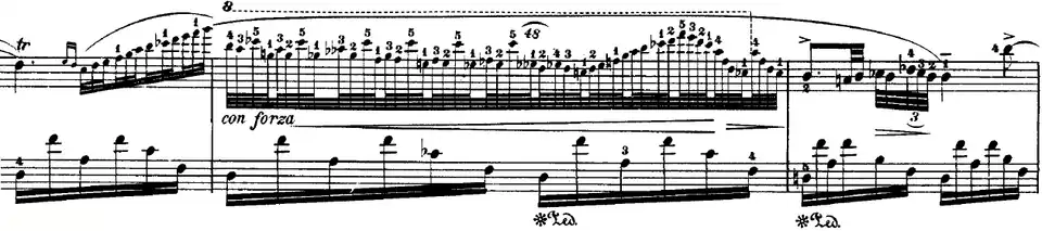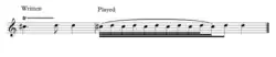 Whether the note should be played before or on the beat is largely a question of taste and performance practice. Exceptionally, the acciaccatura may be notated in the bar preceding the note to which it is attached, showing that it is to be played before the beat.[9] The implication also varies with the composer and the period. For example, Mozart's and Haydn's long appoggiaturas are – to the eye – indistinguishable from Mussorgsky's and Prokofiev's before-the-beat acciaccaturas.