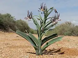 Ornithoglossum vulgare (Afrikaans: slangkop) is a lily characterized by blueish to grey-green, boat-shaped leaves, which clasp the stem and an attractive flower arrangement. The plant usually grows to about 30 cm high, but can grow taller if it receives more moisture.