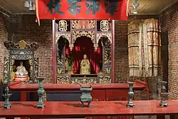 The oldest of the brick temples was completed in 1863 and is named Liet Sheng Kong which translated means "Temple of Many Gods and Goddesses".[3] In this temple visitors were allowed to worship any deity that they wishes to. The interior ceiling and walls of this building are covered with hanging boards with carvings or script to honored or thanking the Chinese deities for answering prayers. The room houses three altars. One teak altar at the front of the temple, brought to the temple from China, shows an elaborately carved courtyard scene, The second altar is used for supporting incense burners and the third (also from China) sits at the back wall of the temple. This altar support three carved, wooden statues representing Chinese deities. On the top sides of this altar there are 2 papier-mâché Southern lion heads employed by the Chinese to ward away evil spirits. These heads were also employed during Chinese festival parades in the area. Just inside of the temple there is a gong and just outside the temple's entry point there is a very large ceremonial urn which also originated from China.