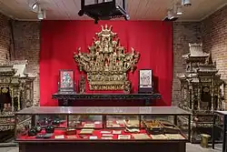 Built in 1864, the Chan Room (adjacent to the Main Temple) is also referred to as "Suey Cing Bak". The room was constructed in remembrance of general Chan Low Kwan (Soong Dynasty) who was also referred to as the "Viscount of Purification". As a note of reference, all by the name of Chan or Chin (Wong Tun district, Toy Sun county of Guangdong province) were direct descendants of Chan Low Kwan. There are many artifacts in this room but one that is most noteworthy is a large, teak bridal sedan chair of Chinese Imperial Palace quality. Equipped with curtains, the chair was used in parades and wedding ceremonies.