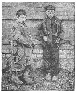 Most besprizornye were beggars.[7] Public response varied, and the media discouraged giving the children any money, recommending donations to charitable organizations instead. When alms grew scarce, children with more experience and energy sought money through selling small items such as flowers or cigarettes. Some were recruited by tobacconists or newspapers to sell their products.[8] Besprizornye also performed tasks for pay, such as carrying luggage at the train station or holding a place in line at the theatre. Some entered restaurants in hopes of obtaining scraps. Competition for locations was fierce.[9] Thousands of children, particularly girls but also many boys, turned to prostitution. Of 5,300 street girls aged 15 and younger surveyed in 1920, 88% had worked as prostitutes. This means of support was more common in the winter, when begging outdoors was more difficult.[10]