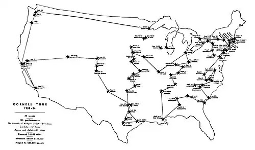 In 1933, Hortense and Roger Hill invited Welles to a party in Chicago, where Welles met Thornton Wilder. Wilder arranged for Welles to meet Alexander Woollcott in New York so he could be introduced to Katharine Cornell, who was assembling a theatre company for a seven-month transcontinental repertory tour. Cornell's husband, director Guthrie McClintic, immediately put Welles under contract and cast him in three plays.[24]: 46–49 Romeo and Juliet, The Barretts of Wimpole Street and Candida began touring in repertory in November 1933, with the first of more than 200 performances taking place in Buffalo, New York.[21]: 330–331