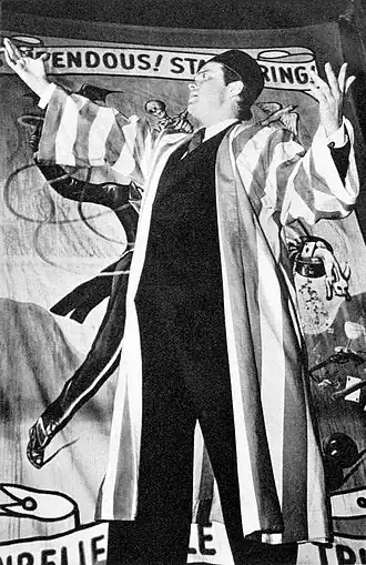 In 1937, Welles rehearsed Marc Blitzstein's political opera, The Cradle Will Rock.[54] It was originally scheduled to open June 16, 1937, in its first public preview. Because of cutbacks in the WPA projects, the premiere at the Maxine Elliott Theatre was canceled. The theater was locked, and guarded, to prevent any government-purchased materials from being used for a commercial production of the work. In a last-minute move, Welles announced to ticket-holders that the show was being transferred to the Venice, 20 blocks away. Some cast, crew and audience, walked on foot. The union musicians refused to perform in a commercial theater for lower non-union government wages. The actors' union stated that the production belonged to the Federal Theatre Project, and could not be performed outside that context without permission. Lacking participation of the union members, The Cradle Will Rock began with Blitzstein introducing it and playing the piano accompaniment on stage, with some cast members performing from the audience. This impromptu performance was well received by its audience.