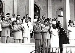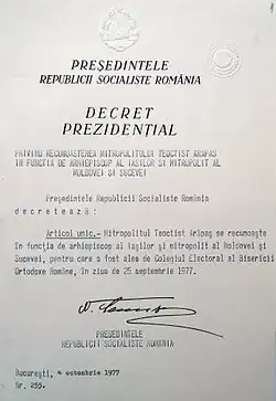 Teoctist Arăpașu became patriarch because of the support of the third patriarch, Justinian Marina. The communist government did not oppose him, as he was known to be obedient and accept compromises.[19] He became known for his acceptance of Ceaușescu's policies, including demolitions of churches in "systematized" areas and defrocking any priests who stood up the government.[19] His lack of reaction in the demolitions of 22 churches in Bucharest was widely seen as a sign of collaboration with the regime.[19] Teoctist's public interventions included laudatory telegrams and speeches about Ceaușescu's achievements.[19]