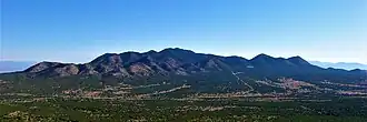 The Ortiz Mountains[1] are a mountain range in northern New Mexico, United States, in Santa Fe County, northeast of the Sandia Mountains and due north of the San Pedro Mountains. The Ortiz include Placer Peak, the highest peak in the range at 8,858 feet,[2][3] Lone Mountain at 7,310 feet,[4] Cedar Mountain at 7,041 feet,[5] Cerro Chato at 6,965 feet,[6] and the foothills known as the Los Lomas de la Bolsa.[7][8] New Mexico State Road 14 passes through the northwestern portion of the Ortiz Mountains between the towns of Golden and Madrid.