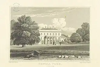 Francis Vernon, his cousin, inherited the estate and he rebuilt the mansion. He also expanded the estate with additional land for an extensive deer park. Thus the estate was known as Orwell Deer Park, or, more simply, Orwell Park. Following his death in 1783, the mansion was bequeathed to his nephew, John Vernon (1776-1818).[2] Upon his death the estate was inherited by his sister, Arethusa (1777-1860),[3] wife of Sir Robert Harland, 2nd Baronet (1765–1848).[2]