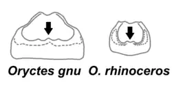 Oryctes gnu is one of the largest species of Oryctes and is usually larger than 50 mm. In his taxonomic review of Oryctes species, Sebö Endrödi gives the length as 54–65 mm for 9 examined specimens.[3] O. gnu can be confused with Oryctes rhinoceros, a species with a similar distribution range. Both species belong to the subgenus Rykanes which is characterized by the end of the hind tibia having only 2 fixed spikes. This similarity has been already noted in the original description of O. gnu as well as that of O. trituberculatus, a synonym of O. gnu, and by various other authors.[1][2][3] However, O. rhinoceros is smaller, usually less than 50 mm long, narrower and males of both species can be readily separated by the shape of the pronotum. In O. gnu the depression (concavity) on the pronotum is very large, broad and has 3 knobs (tubercles) on its hind margin. The depression is smaller and narrower in O. rhinoceros with only 2 knobs, see the arrows in the illustration on the right side.