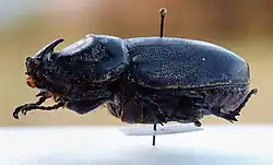 Oryctes gnu, commonly known as Malaysian rhinoceros beetle, is a species of rhinoceros beetles from the subfamily Dynastinae (family: Scarabaeidae) in Southeast Asia and Sri Lanka.[3][5][6] It is a large (usually > 50 mm), brown to black and broadly-built species, with similarities to the smaller (usually < 50 mm) coconut rhinoceros beetle (Oryctes rhinoceros). Apart from the difference in size, both species can be easily separated by the shape of the pronotum. In O. gnu the depression (concavity) on the pronotum is larger with 3 knobs or tubercles at its hind margin.[3] O. rhinoceros has only 2 knobs. Unlike O. rhinoceros, a well known pest of coconut palms, O. gnu is uncommon and has been rarely cited as an agricultural pest.[7][8]