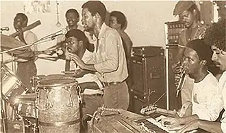 Throughout the period of February-September of 1970, Os Kiezos held their first major concerts at N'gola Cine for Luis Montez’s Kutonoca and Dia Do Trabalhador. It was also during the year of 1970 that they went on to record their first singles under Ngoma, a label from Zaïre that had a headquarters in Luanda. It was during this period that they met Minguito, a blind accordionist with his own conjunto, as well as Elias Dia Kimuezo, a relatively older and well respected singer, Urbano de Castro, the last two being relatively older artists who participated in the Kutonoca shows and had already gained popularity, as well as N’goma Jazz, an ensemble with members from various ethnic backgrounds.[10] Under the Ngoma label, Os Kiezos accompanied Urbano de Castro and Elias Dia Kimuezo. They recorded on a label that featured notable Congolese artists like Franco and his T.P.O.K. Jazz, Verckys et son Orchestre Vévé, Tabu ley Rochereau...