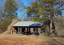 The park also has a large picnic shelter that is suitable for use by large groups. It has a kitchen, a large dining area, and two stone fireplaces on opposite sides of the building.[3]