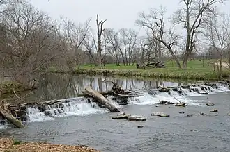 The Osage Mills Dam is a historic dam in rural Benton County, Arkansas. It impounds Little Osage Creek, just upstream of Mill Dam Road (County Road 47), between Rogers and the Northwest Arkansas Regional Airport. The dam was built c. 1890 out of coursed stone with a rusticated face. It was built to provide power to a grist mill that served the area, of which only a small portion of the millrace remains visible. The dam is the only known structure of its type in the county.[2]
