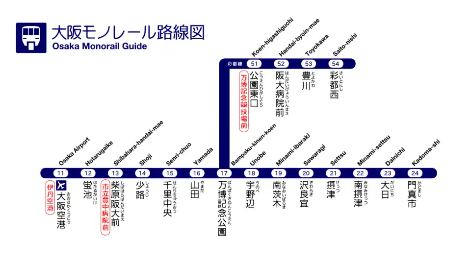 | Operator(s) | Osaka Monorail Co., Ltd. | ||||||||||||||||||||||||||||||||||||||||||||||||||||||||||||||||||||||||||||||||||||||||||||||||||||||||||||||||||||||||||||||||||||||||||||||||||||||||||||||||||||||||||||||||||||||||||||||||||||||||||||||||||||||||||||||||||||||||||||||||||||||||||||||||||||||||||||||||||||||||||||||||||||||||||||||||||||||||||||||||||||||||||||||