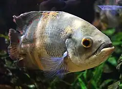 The oscar (Astronotus ocellatus) is a species of fish from the cichlid family known under a variety of common names, including tiger oscar, velvet cichlid, and marble cichlid.[2] In tropical South America, where the species naturally resides, A. ocellatus specimens are often found for sale as a food fish in the local markets.[3][4] The fish has been introduced to other areas, including India, China, Australia, and the United States. It is considered a popular aquarium fish in Europe and the U.S.[5][6][7]
