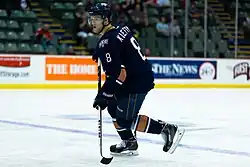 After attending the Edmonton Oilers development camp, Klefbom began his first season in North America with their American Hockey League (AHL) affiliate, the Oklahoma City Barons. The assignment was to retain salary cap space and allow Klefbom to acclimate to the smaller ice.[14] During his time with the Barons, Klefbom worked on improving his overall game including "winning the battles in the corners" and "staying strong in front of the net."[15] Klefbom began the 2013–14 season by recording one assist through 12 games to earn his first NHL recall on 15 November 2013.[16] He did not make his NHL debut during his recall and was reassigned to the AHL shortly thereafter.[17] Upon returning to the AHL, Klefbom continued to work on his game and gathered two more assists before suffering an injury on 28 December. He missed numerous games to recover and rejoined the Barons lineup in mid-January.[18] However, after returning to the lineup, Klefbom continued to grow confident in his game and earned greater responsibilities on the ice. When speaking of this development, Klefbom credited it to working with the Baron's assistant coach every day to improve his skills.[19]